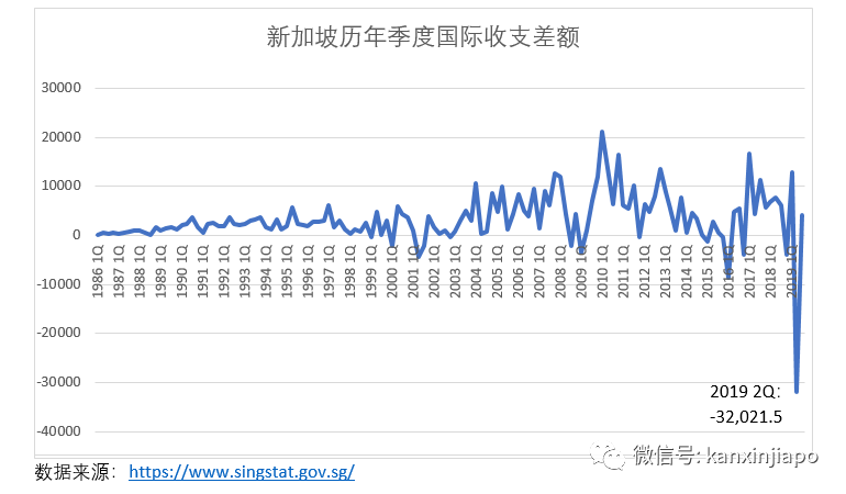 这对整个新加坡的国际收支差额造成了很大的冲击。从上一季度正120亿新元突变负320亿新元。这是近至少33年以来最大的变化。如下图所示: