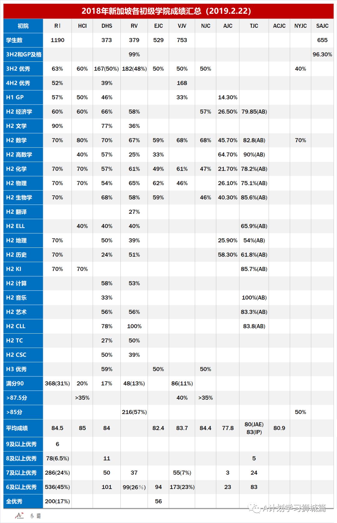 新加坡各初院2018年A考成绩汇总: