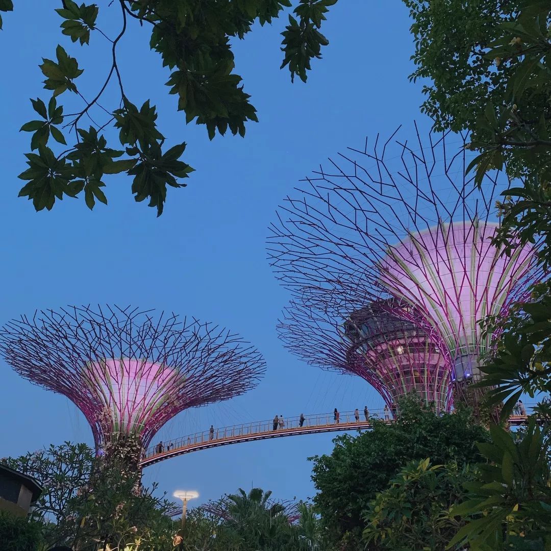 建议七点去,可以散步+看日落~不一定需要进到室内花园里,在室外散步就特别舒服,可以看到夜晚闪烁的Supertree Grove擎天树丛,如果感兴趣还可以走到空中走廊上面去(20:30会关闭售票通道)。一定要走到Dragonfly桥上!太太太浪漫了!!!绝美夜景尽收眼底