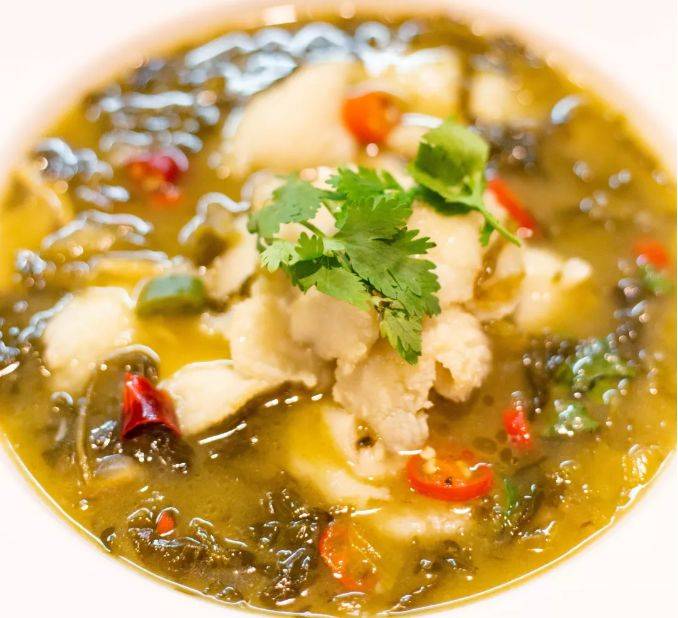 做好的酸菜鱼汤汁金黄,莹润亮泽