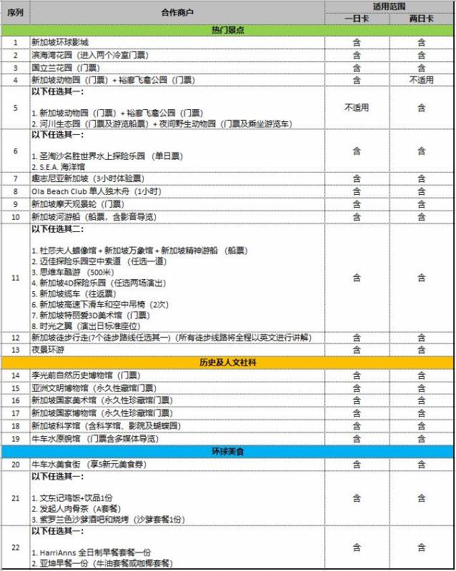 1.环球影城 2.滨海湾花园 3.国立兰花园 4.新加坡动物园 5.裕廊飞禽公园 6.河川生态园 7.夜间动物园 8.圣淘沙水上探险乐园 9海洋馆 10.趣志尼亚新加坡 11.单人独木舟 12.新加坡摩天轮 13.新加坡河游船 14.圣淘沙八景点选两个 15.新加坡徒步旅行 16.夜景环游 17李光前自然历史博物馆 18.亚洲文明博物馆 19.新加坡国家美术馆 20.新加坡国家博物馆 21.新加坡科学馆 22.牛车水原貌管 23.牛车水美食街5新币 24.美食三家选一家 25.早餐两家选一家