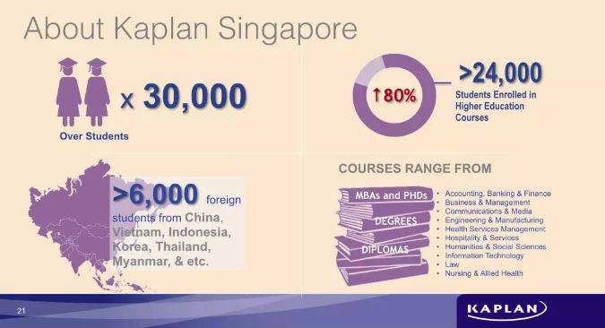 这所座落在新加坡金融和商业中心的学院,为学生提供优质的大专、学士、硕士及博士等高等教育课程,吸引了无数来自世界各地的学生。 Kaplan新加坡校区的学生达3万人次。其中,国际学生约为6000人,新加坡本地的学生高达80%。来这里修读学士学位的新加坡学生,有一半是毕业于新加坡政府理工学院的大专毕业生。(在这里读本科,也算是与理工学院生的另一种殊途同归了。)
