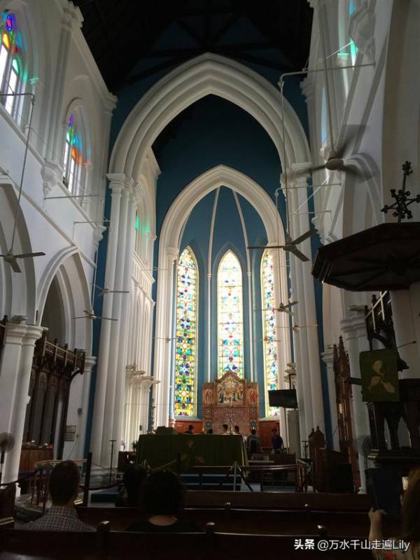 圣安德烈教堂可以免费参观。教堂内部也十分雄伟,白色圆拱形门窗,深蓝色房顶和墙壁,显得素净、典雅又神圣,后殿三面炫目多彩的彩绘玻璃窗具有欧洲教堂同样的风格,每一面彩窗都是对新加坡历史上重要人物的纪念,正中央的彩窗绘著的正是新加坡开埠功臣莱佛士爵士。在这样的教堂里坐一会,内心似乎也变得平静了下来。