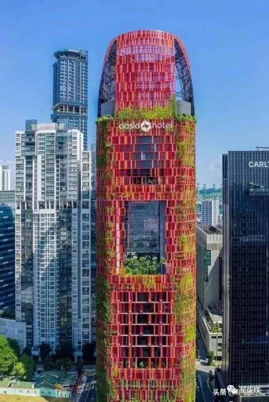 WOHA所设计的Oasia酒店耸立在新加坡高楼云集的中央商务区之中,而无论室内亦或室外空间,景观的用途被进一步扩展,成为了立面建筑材料中不可或缺的一部分。在鲜红的铝制金属网的映衬之下,21种攀缘植被的显得青翠欲滴,五彩缤纷的花果夹杂其中,为鸟类与昆虫提供了充沛的食物。