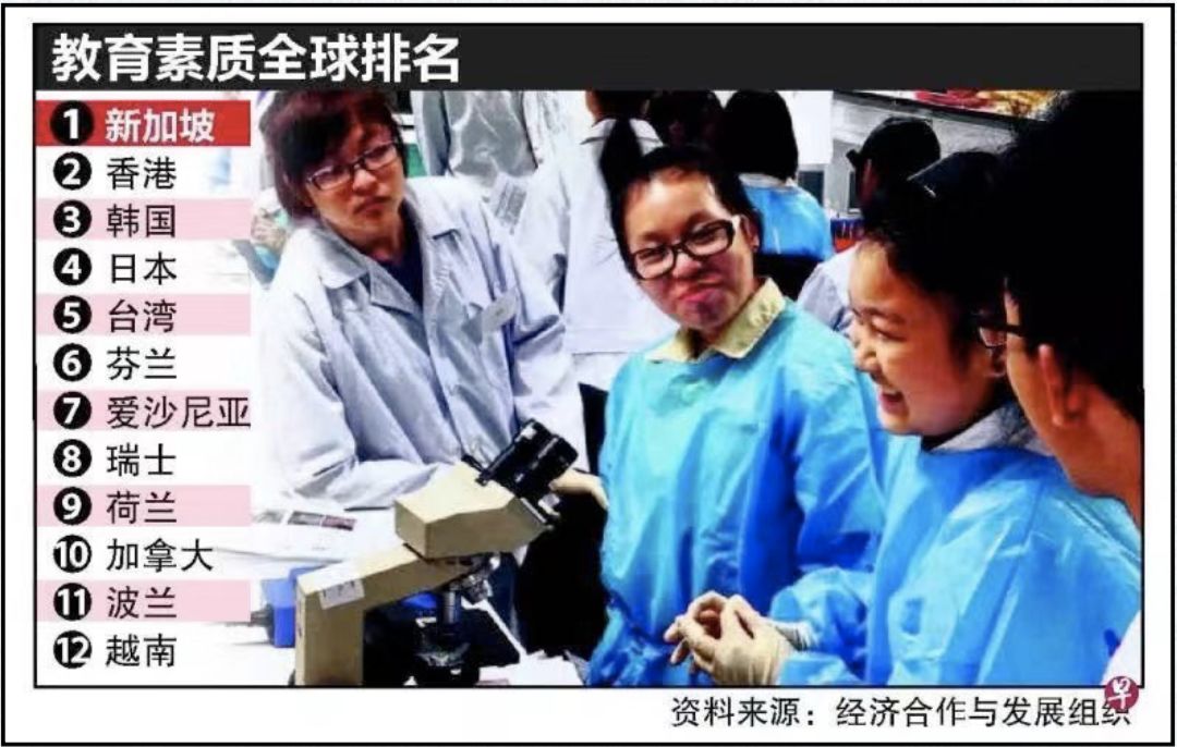 新加坡在经济合作与发展组织(OECD)发表的一项最新教育素质全球排名中,名列榜首。这份报告根据76个国家15岁学生的 数学和科学测验成绩综合统计出排名。