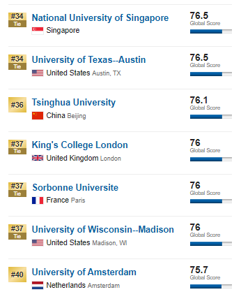 2020年U.S.News世界大学排名,新加坡国立大学,稳居亚洲第1的位置,全球排名第34。南洋理工大学,排名亚洲第3,全球第43。