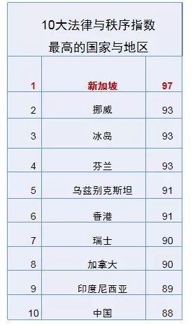 美国咨询公司盖洛普(Gallup)发布的2018年《全球法律与秩序》报告指出,新加坡整体的法律与秩序指数排在全球第一位,达97分。