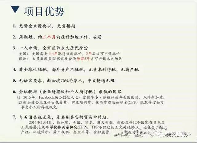 2004年推出的“金融投资者计划”,个人资产不低于2000万新元的人士,将不低于1000万新元资产保留在新加坡5年,就可以申请新加坡永久居留权。