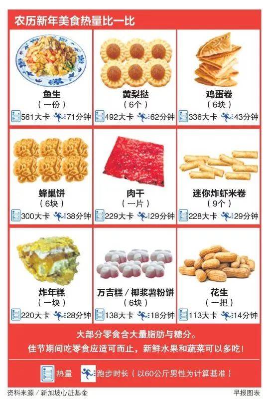 新加坡心脏基金高级营养师林杰指出,新年糕点如煎炸年糕的热量、糖分和脂肪都偏高;奢华年菜如佛跳墙和盆菜则包含大量盐分、饱和脂肪和胆固醇。他建议参考新加坡心脏基金的“心脏健康餐盘”(Heart Smart Eating Plate),从而决定较健康的食用方式。