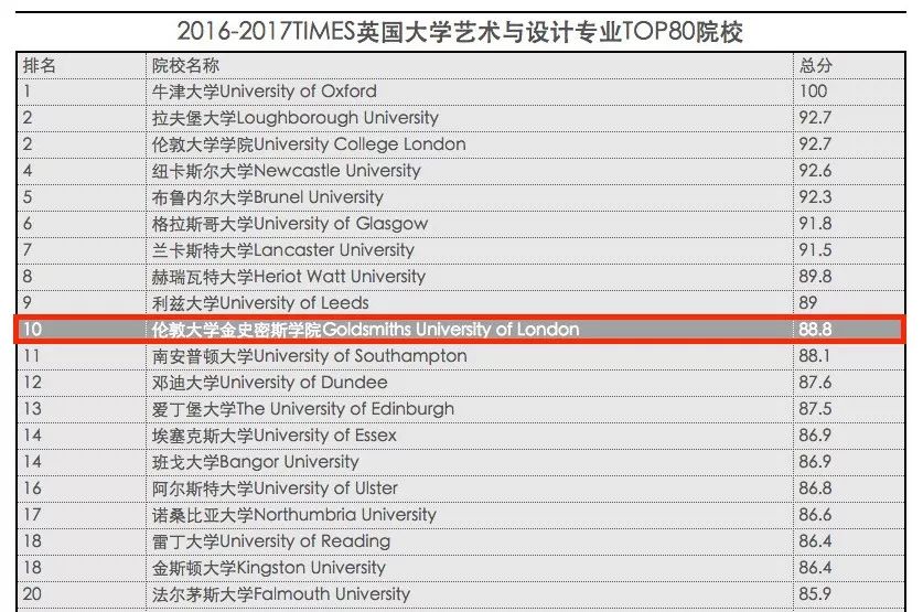 金史密斯学院在TIMES英国大学艺术与设计专业院校的排名中,位列第10,是一所极具创新能力和国际知名度的世界一流艺术类学府。