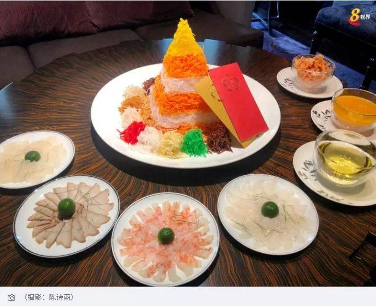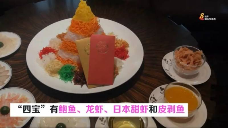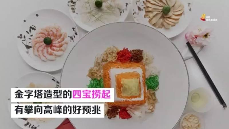 以金字塔造型登场的“四宝捞起”是用鲍鱼、甜虾、龙虾以及皮剥鱼搭配黑露松和金桔酱制作而成,爽口滑嫩,寓意来年攀向高峰~