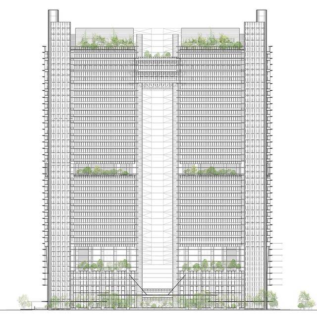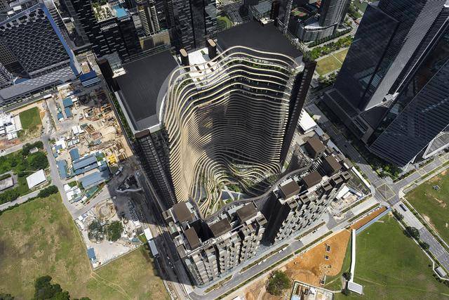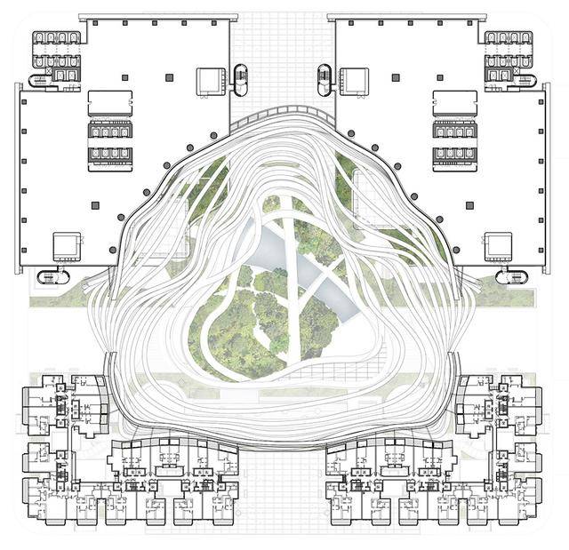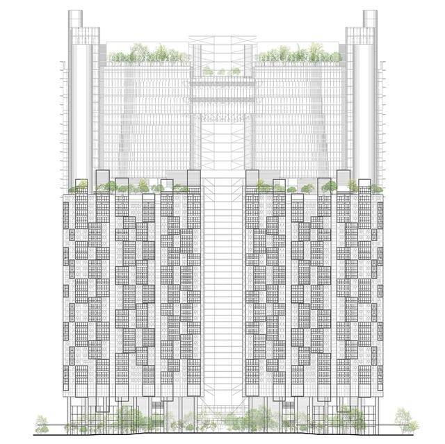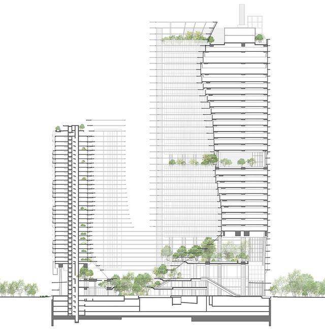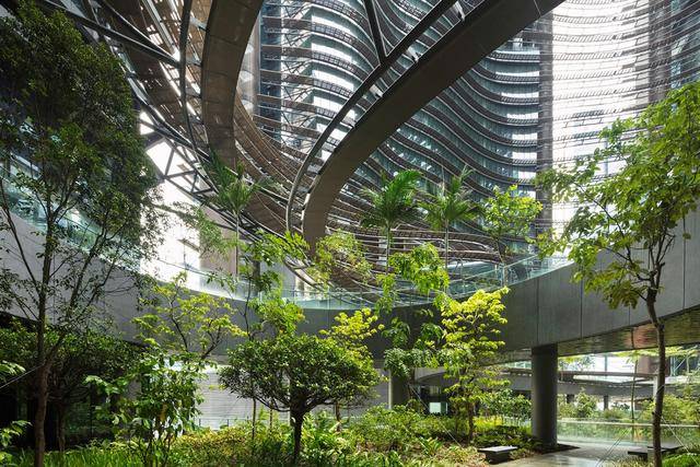 标志性的百叶窗为综合体带来了动态的外观,大面积的绿化区在改善微气候的同时还增加了生物多样性。以亚洲常见的水稻梯田为灵感,由四栋建筑围合起来的中央地带呈现出多层次的立体效果,展现出热带风情的多样性,营造出一个全新的生态。“绿色之心”种植著超过350种不同的树木和植物,包括700棵树,以及3万7千平方米的景观区域。另外还有多种类型的动物在此栖居。参照热带雨林中自然气候的垂直分层,景观设计师模拟出了一个绿色的山谷,使其气候根据层级发生变化。建筑中的餐厅、咖啡厅、健身俱乐部、游泳池、超市、美食街以及位于户外平台的各种活动区域不仅仅服务于居民和办公人员,更提供了社交与互动的场所。