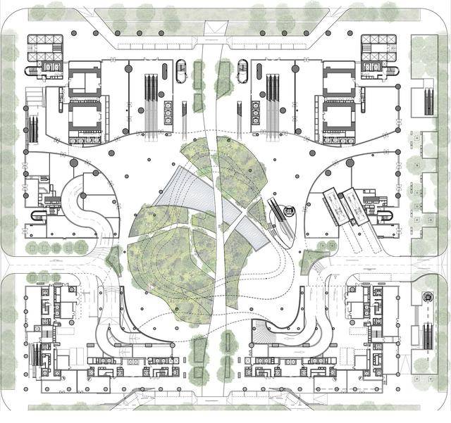 今天,全世界有超过50%的人居住在城市中,在接下来的30年内,这一数字将增至70%。到2050年,世界人口数量将增长到90亿-100亿。这意味着在人口密集的都市区域需要建造足够多的高层建筑才能够适应人口的变化。包含四座高层建筑的滨海盛景,其设计的核心在于塑造一个共享式的中央空间,也就是“绿色之心”。“绿色之心”由 ingenhoven建筑事务所与景观设计事务所Gustafson Porter + Bowman通力协作完成。作为新加坡滨海中央商务区内最大的公共景观区域,“绿色之心”使人们的生活更加接近自然,同时场地中的有效空间达到了原先的125%。