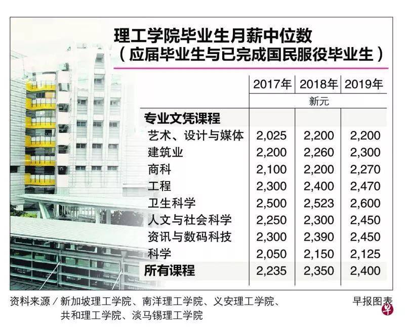最新的调查数据显示2019年毕业半年内找到工作的理工毕业生高过2018年的89.5%以及2017年的87.3%达到了90.7%。找到全职工作的比率达61.1%比2018年高2.1个百分点应届理工学院毕业生的起薪中位数为2400新元比2018年的2350有了提升。具体专业以及月薪中位数见下图图表来自《联合早报》: