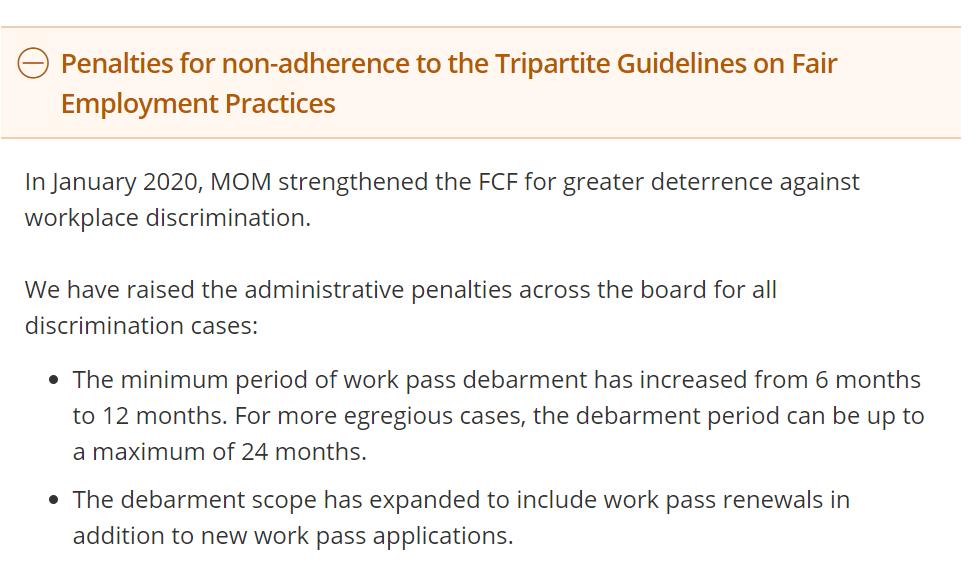 根据《外国人力雇佣法》被指控虚假申报的雇主将面临最高2年的监禁或最高20,000新币的罚款或两者并罚新加坡政府早前就出台“FCF公平计划”( the Fair Consideration Framework)