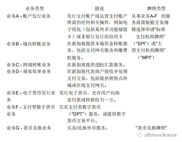 根据 MAS 在 2019 年初发布的《支付服务法案》以及最新公布的《新指南》,以下 7类业务类型均需要申请支付牌照 :