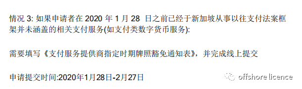 (1)在2020年1月28日即刻前,进行支付性数字货币服务业务的从业人员可获得支付服务法案5(1)、6(4)和第5章条例的豁免;在2020年1月28日起30日内,从业人员需以新加坡金融管理局官网要求方式通知其开始支付性数字货币服务业务的日期,豁免条例从该人员通知当局日期起6月内有效。 (2)如在2020年1月28日起6月期限内,从业人员在段落(1)中提出:(a)根据法案6(1)条例规定,申请进行支付性数字货币服务业务的牌照;或(b)根据法案第122章条例规定,持有大型支付机构牌照或货币兑换牌照的从业人员,根据法案7(1)(a)的规定申请牌照的更改,使其有权进行提供支付性数字货币服务业务,该从业人员段落(1)中的豁免权于当局批准或拒绝申请的日期终止,如申请在改日期前撤回,豁免权则于撤回当日终止。