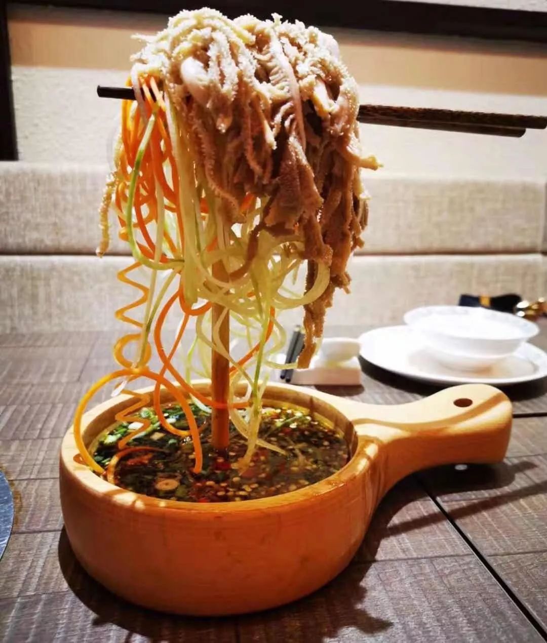 切的细长的肚丝,细长的红白萝卜丝、下面是川椒和麻椒调和的酱汁,蘸一下大口吃,太开胃了!(S$14.8)