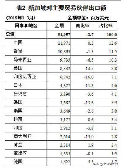 2018年,新加坡的对外贸易总额高达7822.65亿美元,是当年GDP的两倍以上。新加坡最大的出口贸易伙伴是中国大陆和中国香港。2019年一季度,新加坡对中国大陆和中国香港的出口额占比分别达到了12.6%和11.5%。