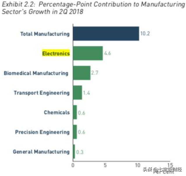 电子产业是新加坡经济的另一大支柱产业。新加坡最早从电视组装起步,现在已发展成为世界上首屈一指的高新电子制造和设计中心。2018年第二季度,电子产业对制造业增长的贡献高达4.6%。另外,虽然受到国际贸易形势和产业周期的影响,2018年,新加坡的半导体产业仍然占到了全球市场份额的11%。