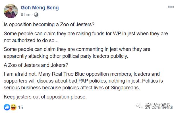 木叔究竟是不是听取了陈如斯的建议,今天才发出公告,无人知晓。我们目前能得知的是,人民力量党秘书长吴明盛对前进党的公告并不买账,深感失望。 “(这份公告)似乎在影射反对党联盟的成员才是将意见透露给主流媒体的罪魁祸首,因为陈仲熙是在一个有反对党联盟成员在内的Whatsapp群组里发出这样的意见,当时他是在‘开玩笑’。 这与事实相差甚远。并非什么鬼影将这个意见转给《海峡时报》这些主流媒体,而是他们在《网络公民》或者IndependentSG的报道中读到陈仲熙的看法时才获知的。 陈仲熙自己也确认说,他向《网络公民》主编许渊臣再三重复了那个“开玩笑的意见”。 释放出这种站不住脚的借口以及毫无根据的影射,根本无助于澄清事实。 做人要诚实。犯错了,就直接认错然后道歉。那才是我们所说的正直( integrity)。 陈仲熙看起来并不像是在对《网络公民》或《海峡时报》开玩笑。 报道说‘当网络公民主编许渊臣问他对计划中的反对党联盟有什么看法时,他说他自己重复对许渊臣说出了那些意见。” 难道反对党要成为小丑动物园? 吴明盛写完这则帖文后似乎还无法解气,一个多小时后又再发一则帖文写道: “反对党是不是要成为小丑(jesters)动物园? 有些人可以开玩笑(jest)自称他们是在为工人党筹款,其实他们根本没有获授权那么做…… 有些人可以自称他们是在开玩笑地发言,实际上是在明显地公开攻击其他反对党的领袖。 这难道是一个由小丑组成的动物园? 恐怕事实并非如此。 许多真正的反对党成员、领袖和支持者会认认真真讨论人民行动党的那些不好的政策,一点都不开玩笑的。政治是一盘严肃的生意,因为政治影响着新加坡人的民生。 请别让小丑混进反对党里。”