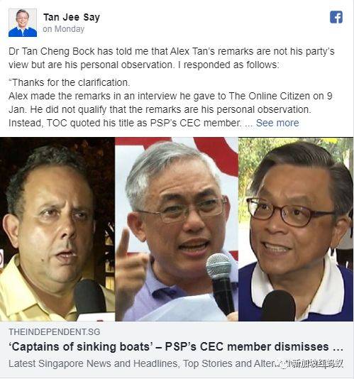 时隔三日,这句话言犹在耳,木叔的队友就因“说错话”触怒了其他反对党大佬。 以木叔为首的前进党今天发公告撇清关系,指那些话纯属个人意见,不代表“陈清木医生与其他前进党中央委员的立场。” 前进党中委对反对党联盟抒发己见 上周四(1月9日),前进党成员陈仲熙(Alex Tan)向本地时政网站《网络公民》形容说: 决定组成反对党联盟的四个领袖,就像是“四艘下沉小舟的船长”,他们驾驶的根本称不上是船,他们只是“手牵着手以免自己被淹死”(clasping one another's hands to save themselves from drowning)。 《海峡时报》1月3日曾报道说,本地四个反对党:国人为先党(SingFirst)、民主进步党(DPP)、人民力量党(PPP)和革新党(RP)决定组成反对党联盟角逐下届大选,拉低三角战的几率。 插播一段历史背景:准备率领反对党联盟的国人为先党秘书长陈如斯1月4日在面簿上写道,他并没有向《海峡时报》透露反对党将组成联盟的消息。 他表示,当时只是跟记者说,反对党联盟的概念是在去年7月首次提出,当时的想法是由反对党组成联盟由陈清木医生率领。但等啊等,陈清木一点动静都没有,他们依旧想推进这个联盟,于是就由他(陈如斯)暂为代表,去游说其他反对党加入联盟。 《网络公民》在上述文章中介绍陈仲熙为前进党秘书长陈清木医生的个人助理(personal assistant),而且也是前进党的其中一名中央委员。