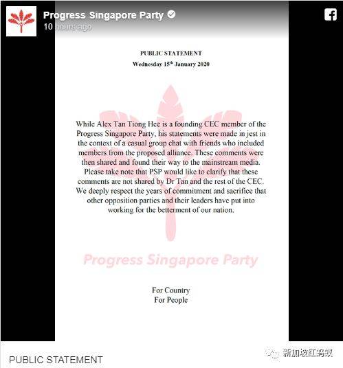 亡羊补牢,前进党面簿上发公告 前进党今天中午12点在面簿上发公告声明: “虽然陈仲熙是前进党的创始中央委员会成员,他的发言是与一群包括反对党联盟成员在内的朋友们,私下在群组闲聊时开玩笑说的。这些意见后来被分享出去,然后就寻到渠道上了主流媒体。前进党想在此澄清,陈清木医生与其他中委成员并不持有相同意见。对于其他反对党与他们的领袖这些年来为了让新加坡能拥有更好的家园所作出的努力与牺牲,我们深表敬意。”