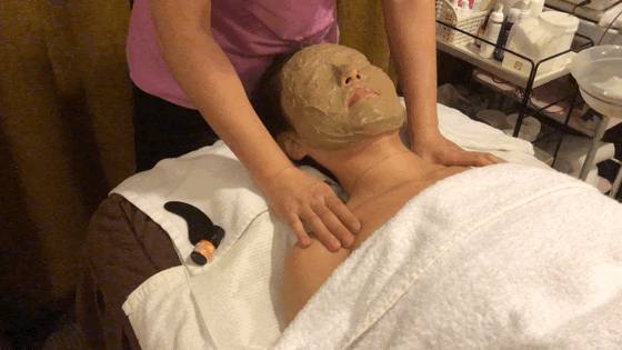 敷面膜的同时,推拿师还在肩颈部涂上精油按摩,Sally舒服到睡着了。