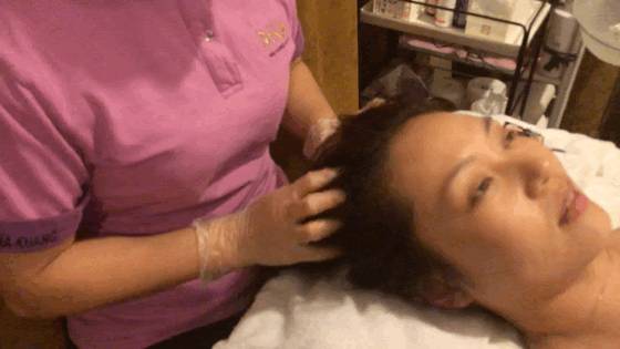 推拿师会先做头部刮痧促进头皮血液循环,然后把生发液均匀地涂抹在头皮上,并轻柔按摩。Sally表示有一点清凉的,还有清香的中药材味,感觉很天然无刺激。