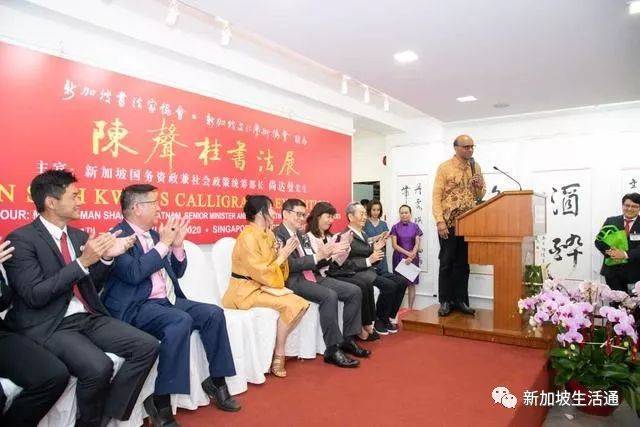 新加坡国务资政兼社会政策统筹部长尚达曼等嘉宾先后致辞。尚达曼致贺辞时表示,陈声桂先生于1968年领导创立新加坡书法家协会以来,长期不遗余力推广普及书法艺术,培养了许多来自不同领域的新晋艺术家;陈声桂先生通过主持国际书法家发展联络会和举办书法展览,促进了国际书法家之间的频密交流,也让新加坡的书法艺术走向了世界舞台;陈声桂先生教授书法艺术满腔热情,诲人不倦,充满真知灼见。尚达曼最后祝愿新加坡书法艺术在坚实的基础上,在未来的日子里能够继续绽放光芒。