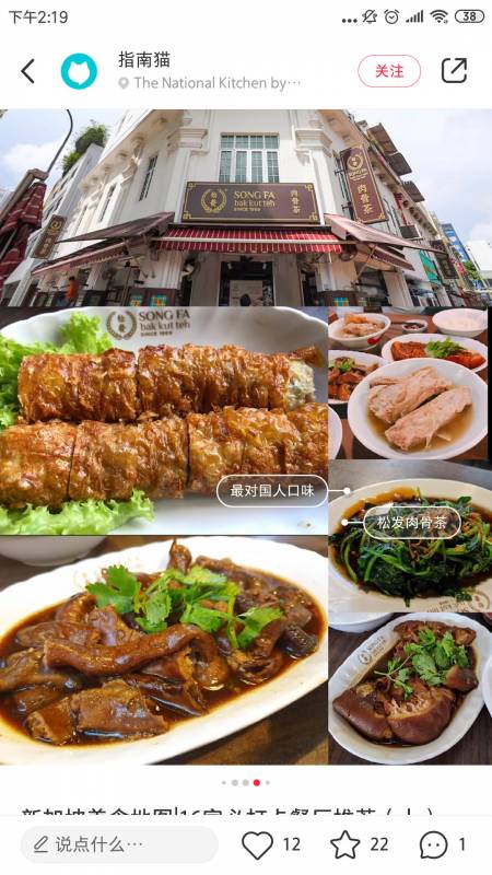 如果你问我,来新加坡一定要吃的是什么,那么毫无疑问,一定是肉骨茶啦!新加坡共有三家出名肉骨茶,其中两家以中药味为主,口味可能不适合国人,但松发是以胡椒味为主。质量上乘的猪骨,配以新鲜的大蒜和白胡椒,经过长时间文火煨制,熬制出具有特色的肉骨汤,汤色清淡,味道辛辣,散发着胡椒清香!烧肉,卤猪脚,凤爪以及空心菜,也绝对会惊艳你的味蕾。建议错过高峰时段哟,排队要很久。