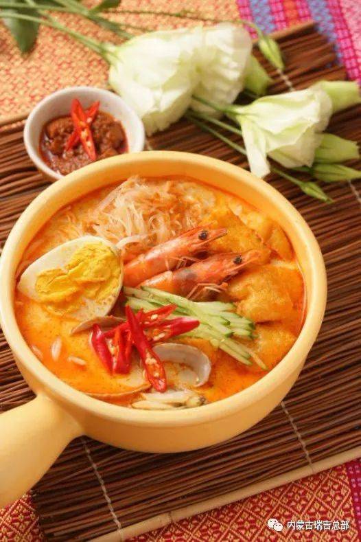 叻沙是一道娘惹独创佳肴,正宗的娘惹叻沙讲究椰浆的鲜味、鲜虾的甜味和自制辣椒油的辛辣味道。