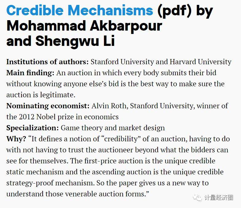 关于为什么提名Shengwu和Akbarpour的作品为2018年最具影响力的研究之一,罗斯表示,他们的研究定义了拍卖的“信誉”概念。