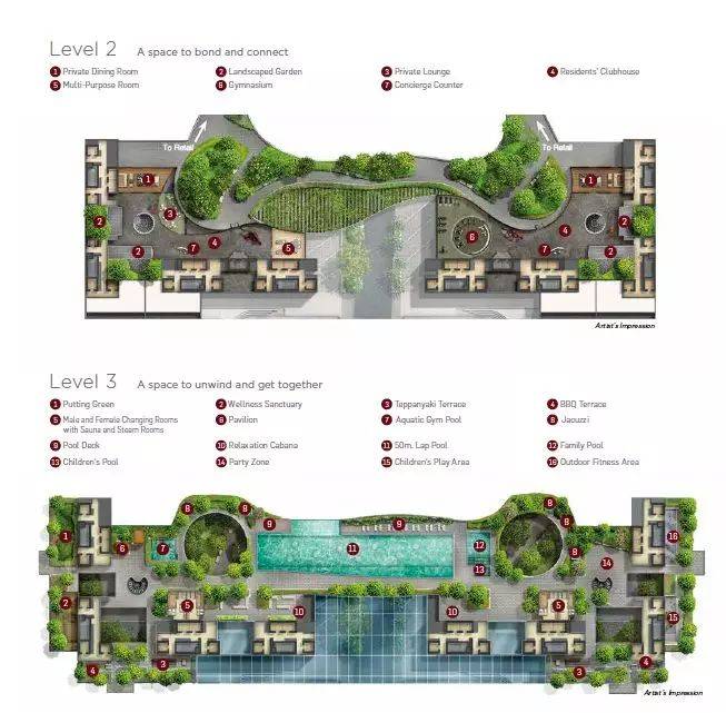 公寓通过大量的开放空间和葱郁的绿化提升给住户不一样的视觉体验。凸显了新加坡“城市在花园”的概念,是建筑风格独特的“绿色心脏”的多样化花园。