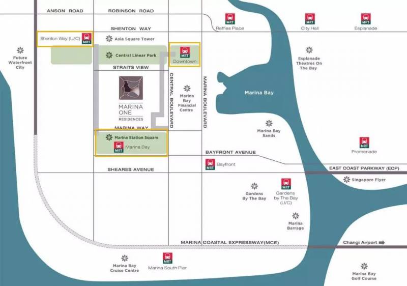 Marina One Residences (滨海盛景豪苑)是新加坡唯一一个近三个地铁站联接四条地铁线的项目。
