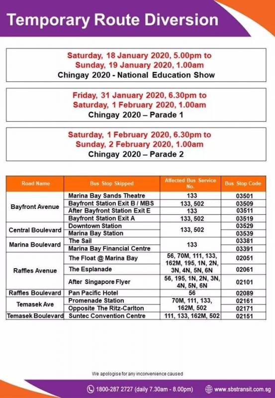 56、70M、111、133、162M、195、502号巴士,以及六辆Nite Owl巴士(1N、2N、3N、4N、5N、6N号)将不会经过政府大厦和滨海湾区域路段。