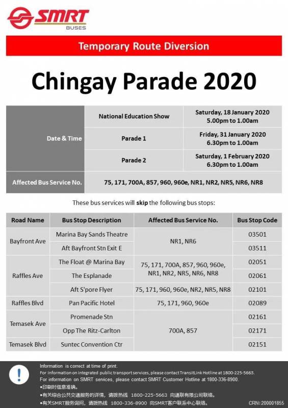 在坡岛的小伙伴们请注意!为了配合一年一度的妆艺大游行,以及本周六要举行的国民教育预演,接下来1月18日(明天)、1月31日(周五)和2月1日(周六),新加坡部分巴士服务将暂时改道。