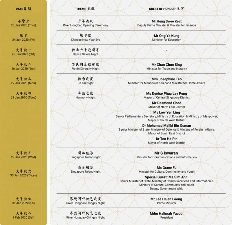 时间:2020年1月31日和2月1日地点:F1维修大楼网址:https://www.chingay.org.sg/春到河畔今年的春到河畔将从1月23日起一直举行到2月1日,每晚都有不同的精彩主题,地点在滨海湾浮动舞台。