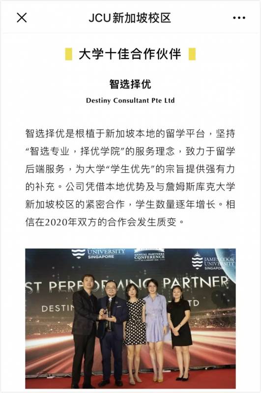 2019年的十佳合作伙伴中 中国的团队占了7席 包括新东方、启德等上市大公司 我们智选是为数不多的 植根于新加坡的留学平台 正是发挥本地优势 才能与JCU如此紧密地合作