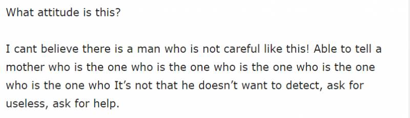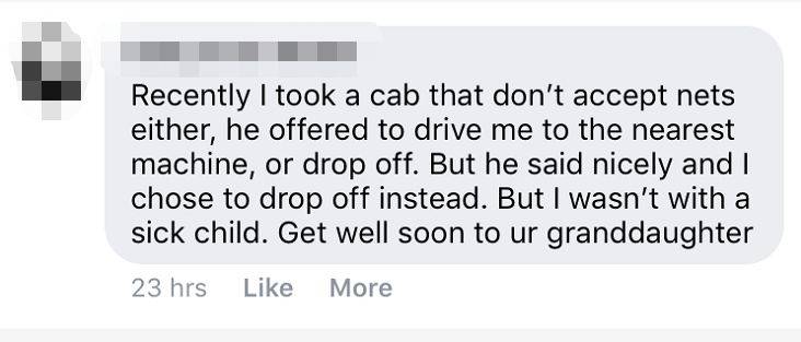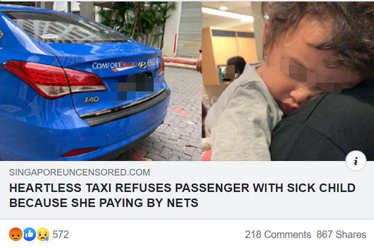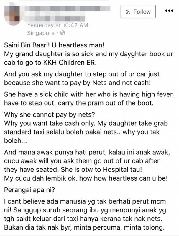 我不能相信这个男人竟然可以如此不在意!仅仅是因为她要用NETS付款,就让一个带着生病孩子的妈妈下车!她并不是不想付钱,她没有要坐免费的士,她也没有向你求助。”