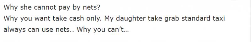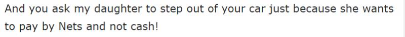 “为什么你只要现金。我女儿叫的是Grab的标准的士车,一直以来(付款)用的都是NETS......为什么就你不可以......”