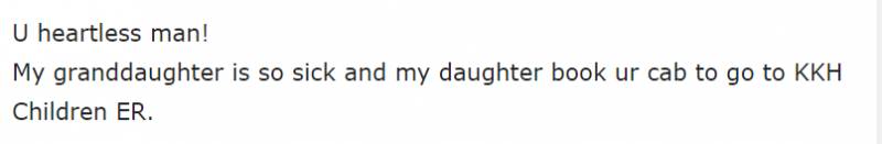 “你这个无情的人!我的孙女生了很重的病,我的女儿才叫你的车要去KK儿童急诊。”