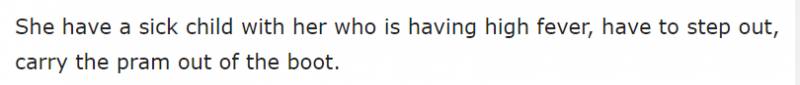 “她的女儿生病了!高烧!(你还让她自己)把婴儿车(从你的)后备车厢里搬出去。”