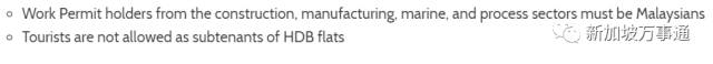 3、根据规定,WP的持有者(建筑、生产、海事、加工行业)不可以租整套的组屋,只有马来西亚籍的可以。但是马来西亚籍的WP租了整套组屋之后,不能够分租给其他人!