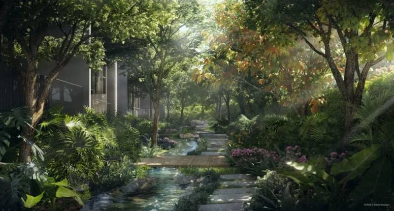 富饶的花园景观静候您的到来,落客区的两侧是一系列舒缓流动的水景,伴随着潺潺水流声欢迎您回家。