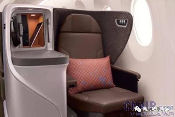 新航全新A350-900中程客机商务舱座椅由Stelia Aerospace公司制造,采用前向式1-2-1交错排列方式,确保所有乘客都能直接进入过道。所有座椅都能放平为76英寸全平躺睡床,即使在最短程的航班上也能为商务舱乘客提供更舒适的飞行体验。所有座椅宽度均为26英寸,配备可伸缩、可升降的扶手。