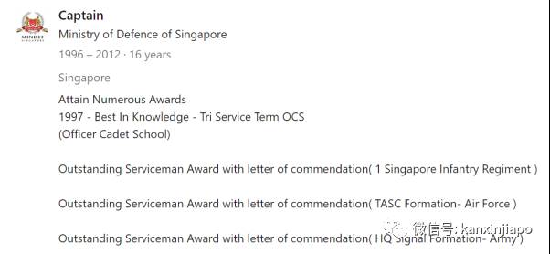 所以,尽管我们不敢怀疑Chew先生学历造假,但我们有理由相信Chew先生在填写领英信息时犯了错了。不然,今年44岁的Chew先生,在1980年,也就是他四岁时就从University of Singapore本科毕业,然后在1996年20岁时又从容不迫去考个大专文凭,证明自己不但可以考本科学位,考个大专文凭也是不费力的。 不管怎么说,Chew先生1996年大专毕业后,从军了。根据领英上的公开信息,他服役16年,曾多次获奖。1997年,他从见习军官学校毕业,获少尉军衔,根据新加坡武装部队惯例,一年后自动升为中尉。不过在十五年后退役时,军衔是上尉,官运似乎不是很亨通。这大概凸显了Captain Chew周上尉做事老实本分务实低调,不吹牛拍马的性格。