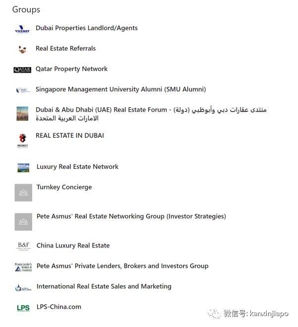 为了避免大家误会周先生Mr Zhou是中国移民,我们还是称他为Chew先生比较合适。 继续看Chew先生在领英上的公开信息。他参加的群组,确实是绝大多数属于房地产类: