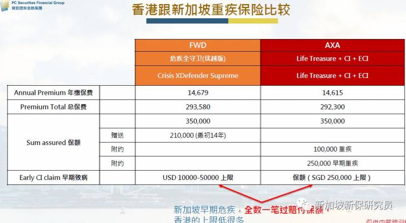 另外相对于香港来说,新加坡的保险的优势还有不少,举例重疾保险比较图,可以供大家参考: