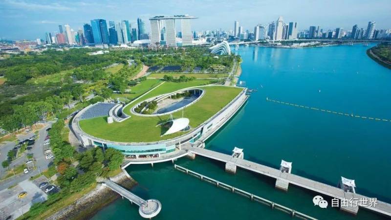 从滨海湾花园往南走不远,就是海湾水闸,是海湾与马六甲海峡之间的控水闸门。水闸旁边的圆形建筑有巨大的露天草坪,是野餐和放风筝的好地方。本地人经常周末带着家人来此休闲。这里也是观赏滨海湾花园和滨海湾金沙酒店全景的好地方。从水闸上走到对岸,就是滨海外花园的东部花园,整个海湾沿岸都是锻炼休闲的热门地点。